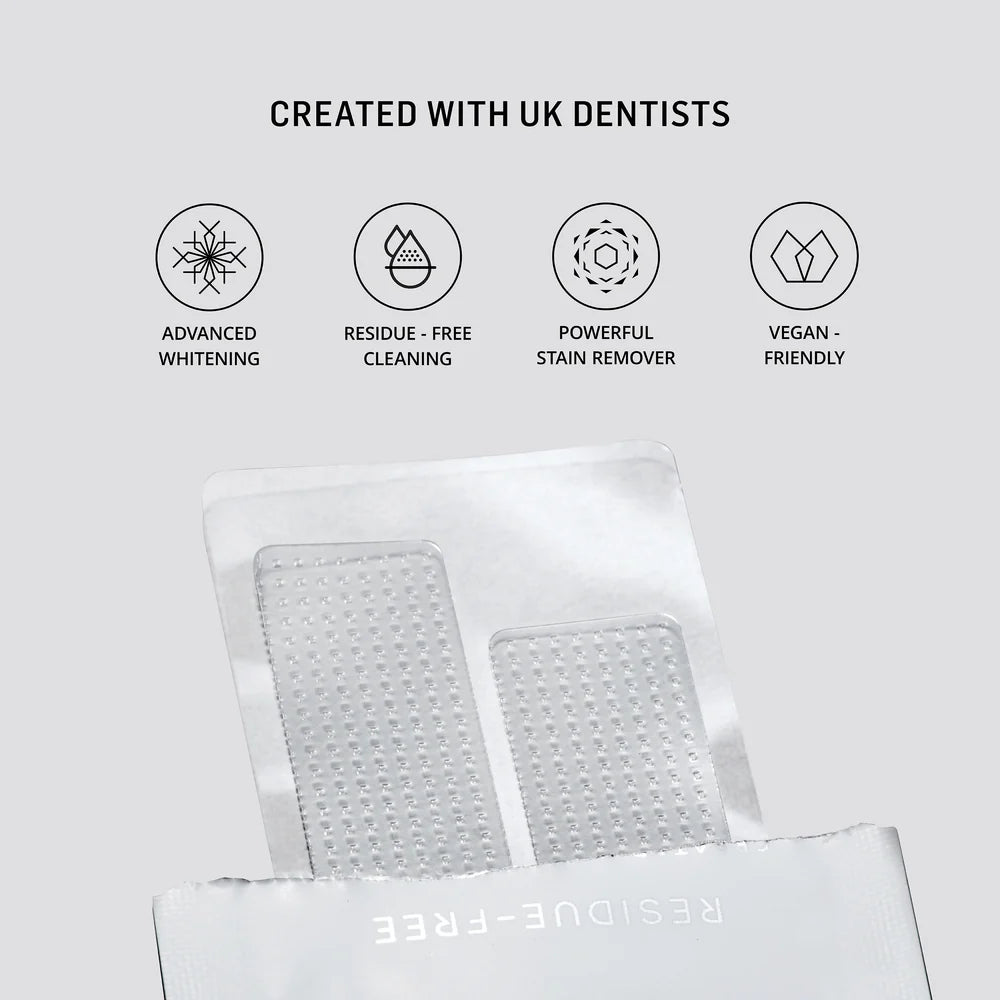 Formulated by UK Dentists, our award-winning, enamel safe Whitening Strips provide visibly whiter teeth, with zero sensitivity from the comfort of your home. Use for 30 minutes a day to gently remove light stains and whiten teeth, or use for up to 60 minutes per day to help remove deeper stains and brighten teeth in fewer treatments. Vegan-Friendly. Cruelty free, PETA Approved. Formulated by UK Dentists.